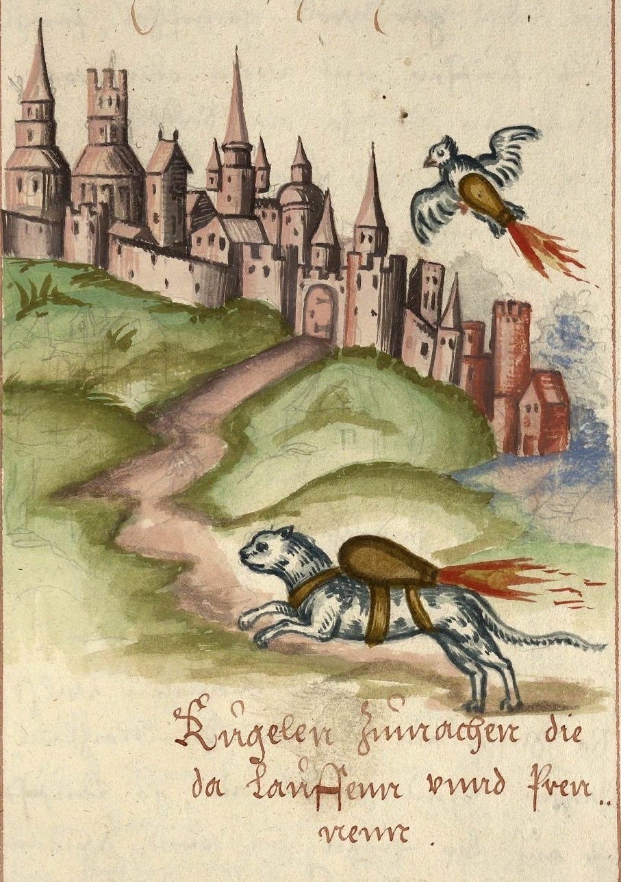 In order to set fire to well-fortified cities that were impregnable to other forms of attack Helm proposed the use of the “rocket-cat”. Now you may think that is some kind of mistranslation, or misunderstanding. Surely he didn’t propose using cats with rockets attached to them? Nah. He did. He totally did. How did the “rocket-cat” work? Helm usefully explains what to do in the text: