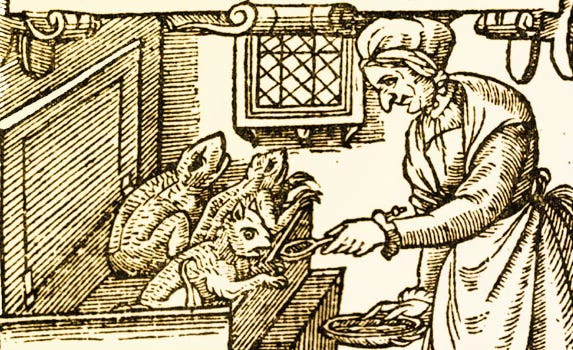 There is an extensive list of folk tales that tell some form of the “woman and cat sharing injuries story”. From the Netherlands there is the story of a cat that has a pan of hot butter thrown over it, only to reappear as an old woman, covered in burns the following day. In both Norway and Germany tale is told of a cat that had its paw cut off, only for the following day the miller’s wife to be missing a hand.7 And other versions also exist from Wales, Austria, and the USA where the woman isn’t necessarily the miller’s wife, but the whole severed paw/hand thing happens.