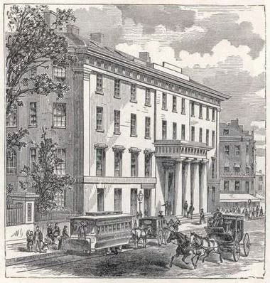 City Hotel, [operated] by Chester Jennings, is the chief place of resort, and … the loftiest edifice of that kind in the city, containing more than one hundred large and small parlours and lodging-rooms, besides the City Assembly Room, chiefly used for Concerts and Balls. The rooms appropriated for private families, parlours, and dining rooms are superbly fitted up, and constantly occupied by respectable strangers. Extensive additions have recently been made to this establishment. The principal Book stores and Libraries are in the vicinity. Prices, over two days, $1.50 per day, $10 per week,3 $416 per year—Board only, $5.50 per week, dinner only, $3.50 per week.