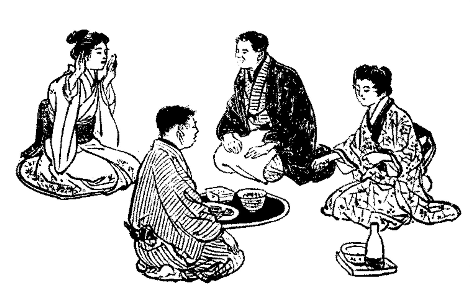 The game is played by two persons, who must move their hands with uniform rapidity, for the game is spoilt if either side moves more quickly or slowly than the other. It is a favourite game at convivial parties, especially if one of the parties is a geisha, though it is not so popular now as it used to be. The person who beats the other three times running is declared the winner, and the defeated party has, as forfeit, to drink a cup of sake.6 The stone-ken is played with one hand; in this the closed hand represents a stone, the open hand a piece of paper, and two fingers or a finger and the thumb spread out a pair of scissors; the stone may be wrapped in the paper, but is proof against the scissors, which may, however, cut the paper. This ken is played less often as a game than for deciding in a case where one would toss a coin in England, for tossing up is unknown in Japan.