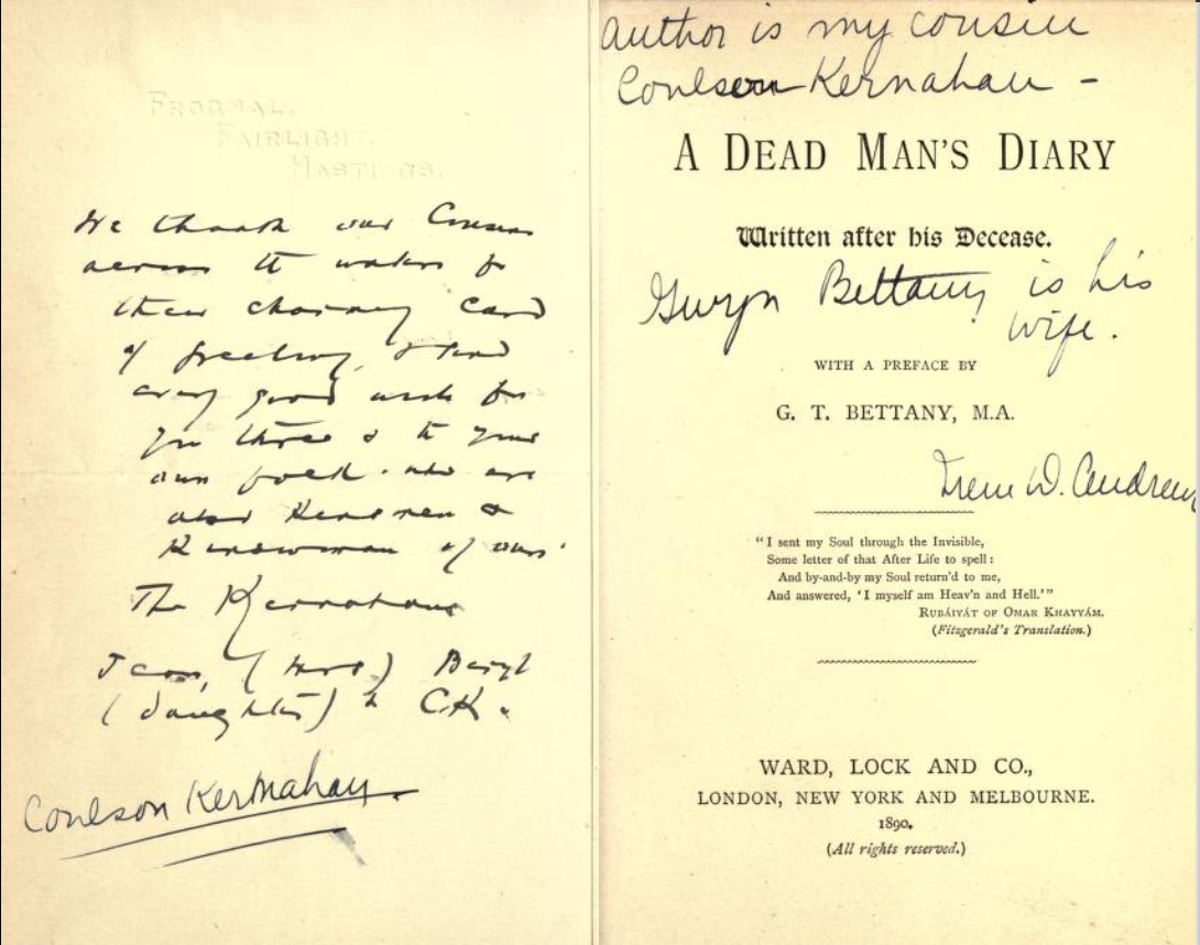 The unmasked Coulson Kernahan was in fact a prolific author of the era, often in conjunction with his wife, Jean Gwynne Bettany. The University of Reading has a collection of their letters.