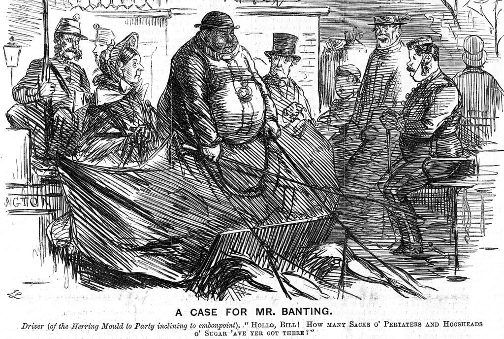I have been in dock, perhaps twenty times in as many years, for the reduction of this disease, and with little good effect—none lasting. Any one so afflicted is often subject to public remark, and though in conscience he may care little about it, I am confident no man labouring under obesity can be quite insensible to the sneers and remarks of the cruel and injudicious in public assemblies, public vehicles, or the ordinary street traffic; … therefore he naturally keeps away as much as possible from places where he is likely to be made the object of the taunts and remarks of others.