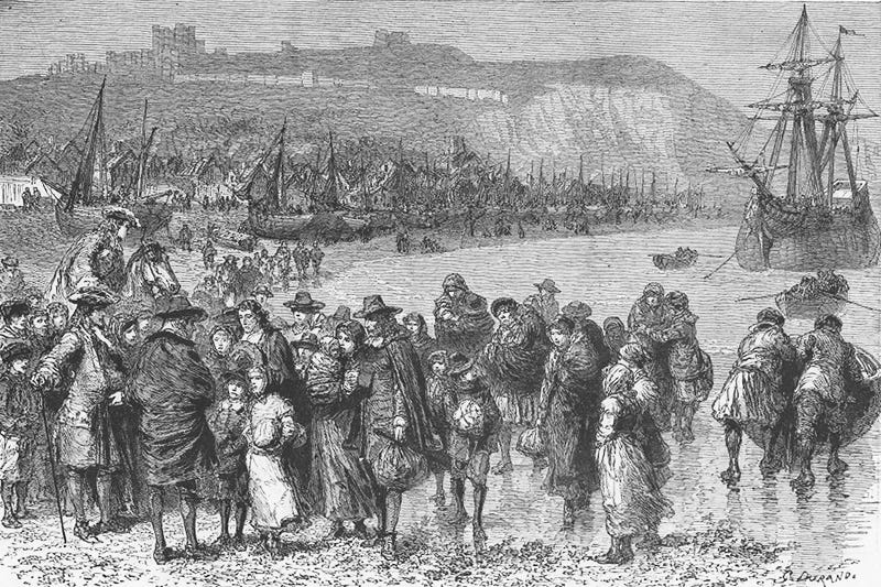 These were the people who first gave us the word ‘refugee’, from the French refugié. (History of course has seen many waves of refugees of one kind or another before and since, and boats crammed with desperate, persecuted people sadly still arrive frequently via France more than 300 years after the Huguenots came in significant numbers.)