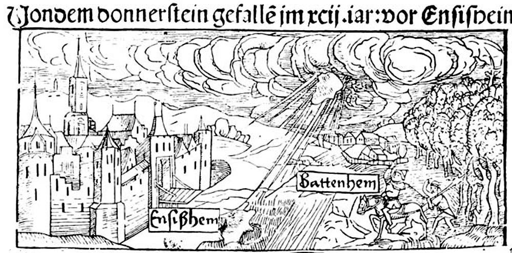 It’s 1492 (again). A thunderous fireball shakes the Upper Rhine, a 127 kg (280 lbs) meteorite landing in a wheat field outside the village of Ensisheim in what is now Alsace, France – the explosion is heard up to 150 km (93 miles) away . The “heaven-sent stone” draws the attention of the humanist and satirist Sebastian Brant (best known for The Ship of Fools),1 who rushes a poetic broadsheet into print at Basel – Latin verses with facing German, casting the fireball’s fall as a divine omen favouring the Habsburg army. The Ensisheim stone, as it became known, was chained up in the church; and Brant’s verses and subsequent chronicles influenced by them turned it into a pan-European marvel. Here’s an extract of Brant’s verses (translated from the Latin):