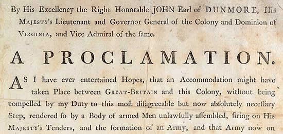 As I have ever entertained Hopes that an Accommodation might have taken Place between Great-Britain and this colony, without being compelled by my Duty to this most disagreeable but now absolutely necessary Step, rendered so by a Body of armed Men unlawfully assembled, bring on His MAJESTY’S Tenders, and the formation of an Army, and that Army now on their March to attack His MAJESTY’S troops and destroy the well disposed Subjects of this Colony. To defeat such unreasonable Purposes, and that all such Traitors, and their Abetters, may be brought to Justice, and that the Peace, and good Order of this Colony may be again restored, which the ordinary Course of the Civil Law is unable to effect; I have thought fit to issue this my Proclamation, hereby declaring, that until the aforesaid good Purposes can be obtained, I do in Virtue of the Power and Authority to ME given, by His MAJESTY, determine to execute Martial Law, and cause the same to be executed throughout this Colony: and to the end that Peace and good Order may the sooner be restored, I do require every Person capable of bearing Arms, to resort to His MAJESTY’S STANDARD, or be looked upon as Traitors to His MAJESTY’S Crown and Government, and thereby become liable to the Penalty the Law inflicts upon such Offences; such as forfeiture of Life, confiscation of Lands, &c. &c. And I do hereby further declare all indentured Servants, Negroes, or others, (appertaining to Rebels,) free that are able and willing to bear Arms, they joining His MAJESTY’S Troops as soon as may be, for the more speedily reducing this Colony to a proper Sense of their Duty, to His MAJESTY’S Crown and Dignity…